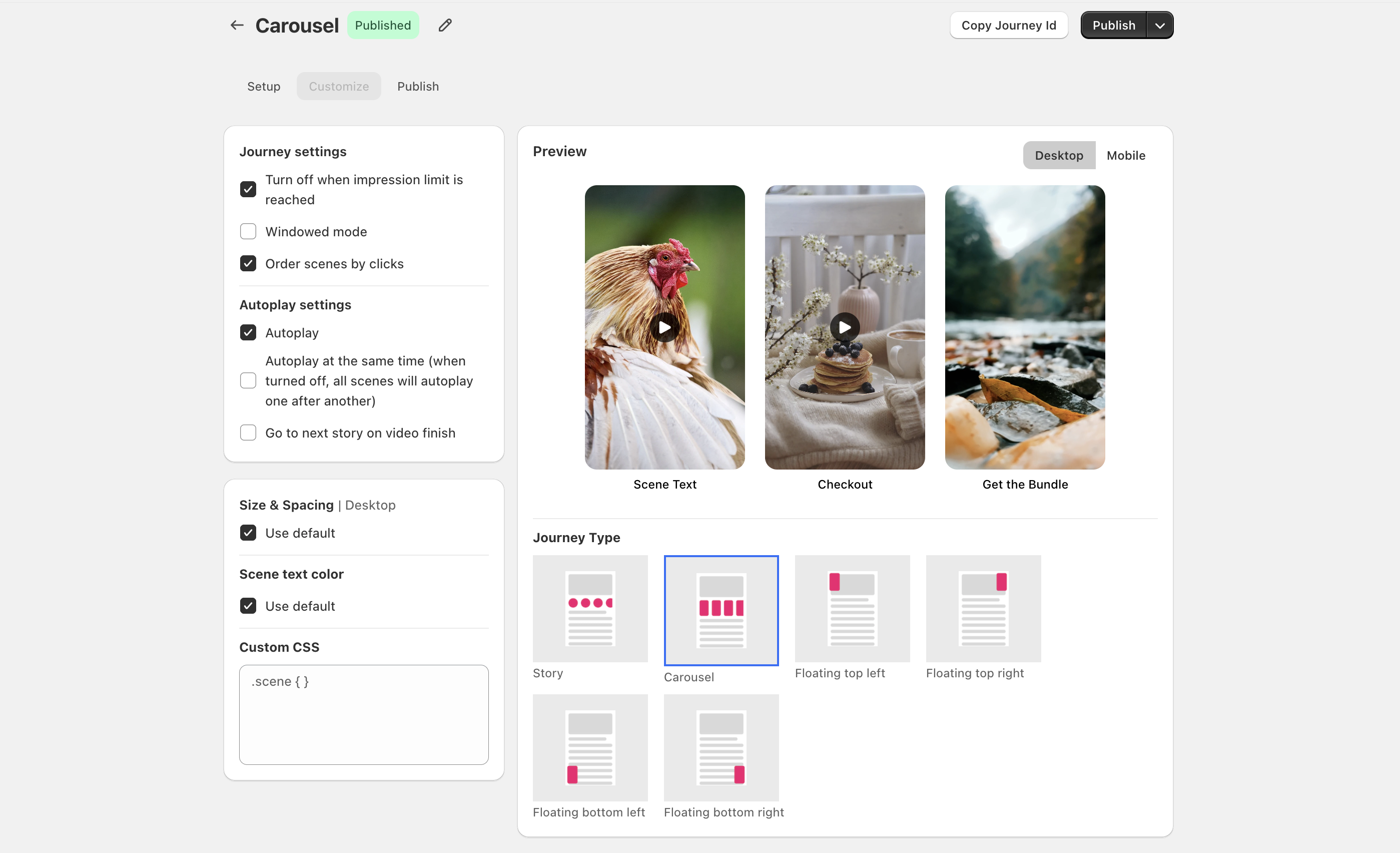 Journey Customization: Controls how the widget looks on your website (e.g., the Story bubbles or Carousel cards).