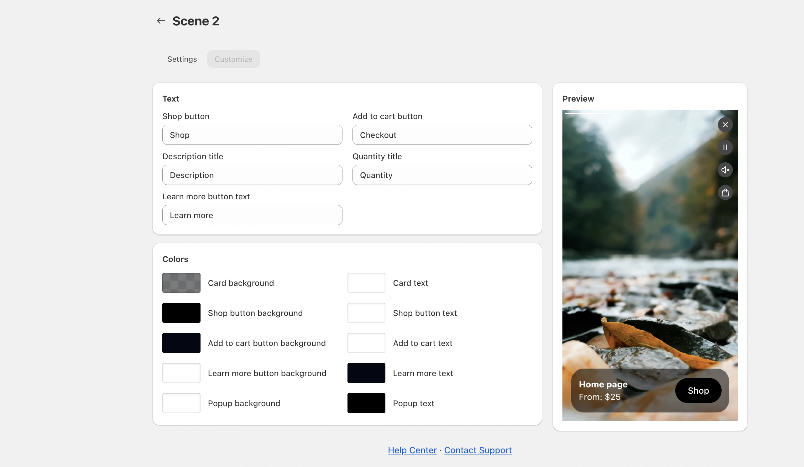 Shop button: The small overlay text on the video preview (e.g., change "Shop" to "View").